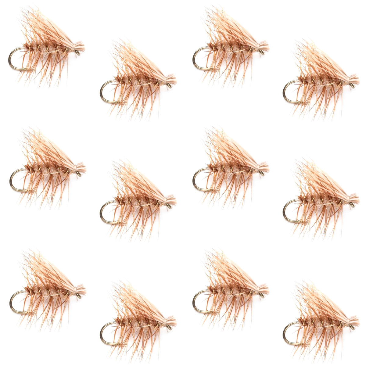 Set of 12 hand tied fly fishing dry flies on barbless hook size 12