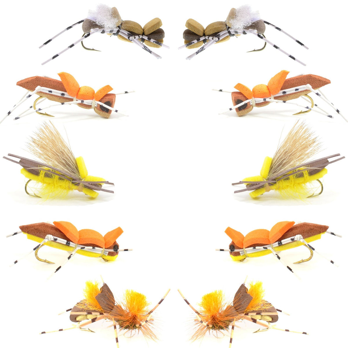 Basics Collection - Foam Hoppers Dry Fly Assortment - 10 Dry Fishing Grasshopper Flies - 5 Patterns - Hook Size 10