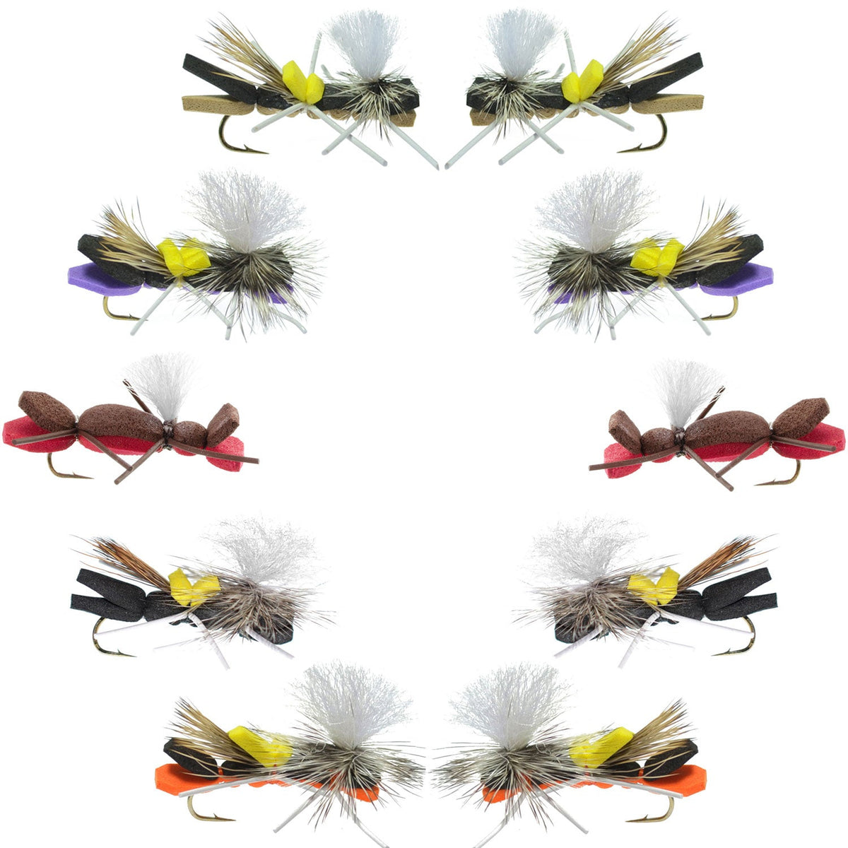Basics Collection - Parachute Chernobyl Ant Foam Dry Fly Assortment - 10 Dry Fishing Grasshopper Dropper Flies - 5 Patterns - Hook Size 10