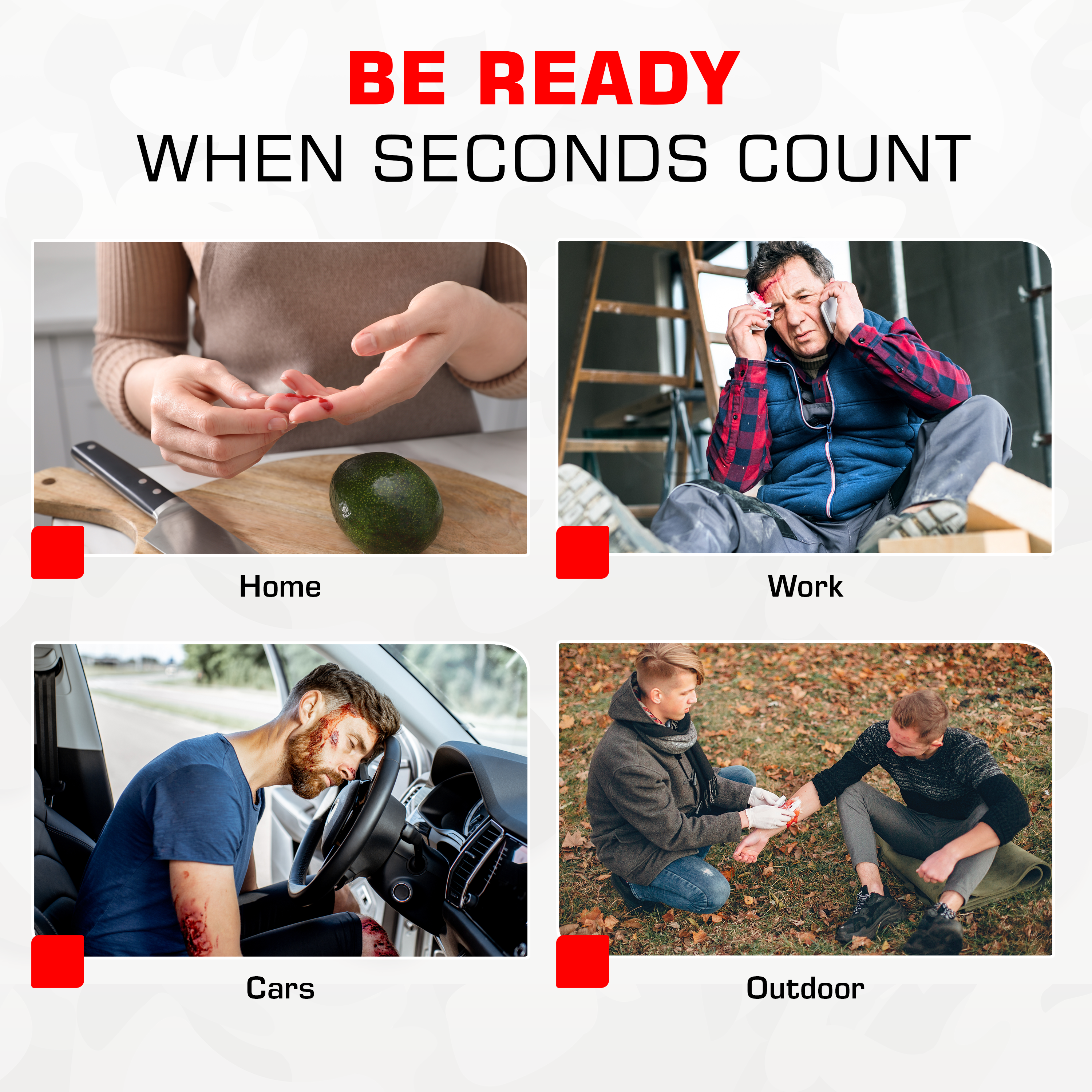 Includes SWAT-T tourniquet, emergency bandage, and compressed gauze for critical bleeding response.
