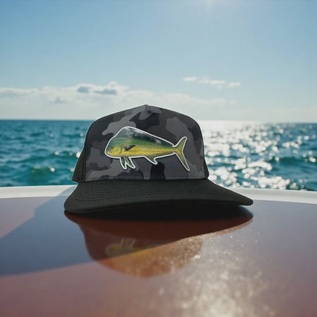 Built for anglers who live the offshore grind, the Get Tight Gear Black Camo Hat combines style, performance, and durability. Featuring a premium water-repellent 5-panel design and breathable mesh backing, this hat keeps you cool while holding up to salt, sun, and spray. The bold camo pattern is paired with a raised UV-printed fish patch — your choice of Mahi Mahi, Sailfish, Swordfish, or Tuna — making it a statement piece whether you’re on deck or at the dock bar.