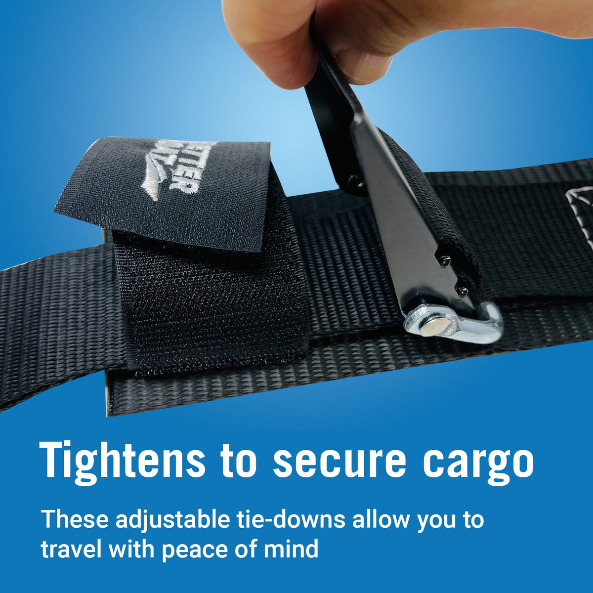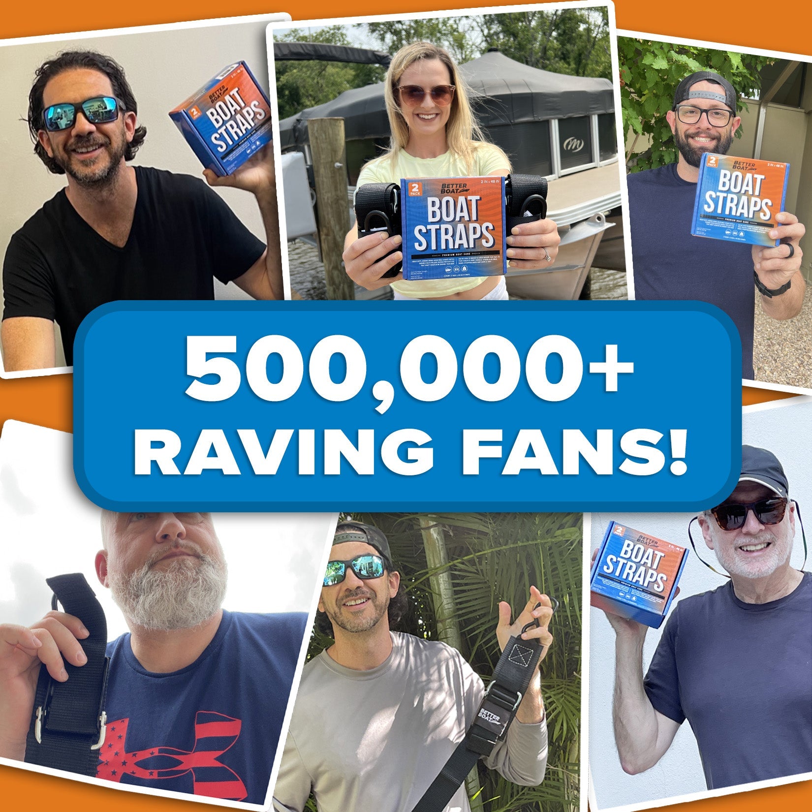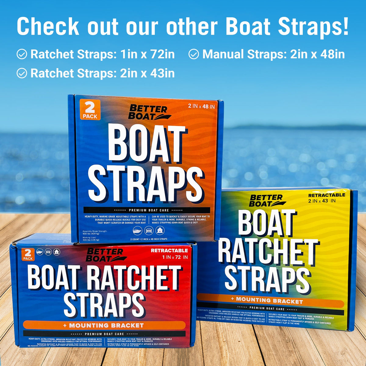 Our premium-grade, 2-inch boat trailer tie down straps are simple to use and are designed to minimize any possibility of movement while you transport anything by trailer. Adjust to as long as 48" (4 foot) or reduce it down to be small and short for smaller vessels. The minimum length would be 13.5" from just inside the outer portion of the loop to just inside the outer portion of the other loop. These straight out-of-the-box, easy-to-use boat trailer tie down straps aren't like traditional straps kits or chains. Thanks to the quick release buckle mechanism, you can fasten and adjust your craft quickly and efficiently and be ready for the ocean in no time. The rubber coated hooks at the end of the straps securely attach to the railing on your trailer to assure you peace of mind and reliable mobility. These 2-inch tie down straps are made from premium-grade nylon fabric and have a breaking point of 900 lbs. with a working load limit of 300 lbs. The buckle is stainless steel and separated from your boat by a wide protective nylon backing. We proudly stand behind the quality of all our products. Our boat strap is definitely a must-have if you're planning on moving your boat. We are a family-owned American business committed to making premium quality products and exceptional customer support.