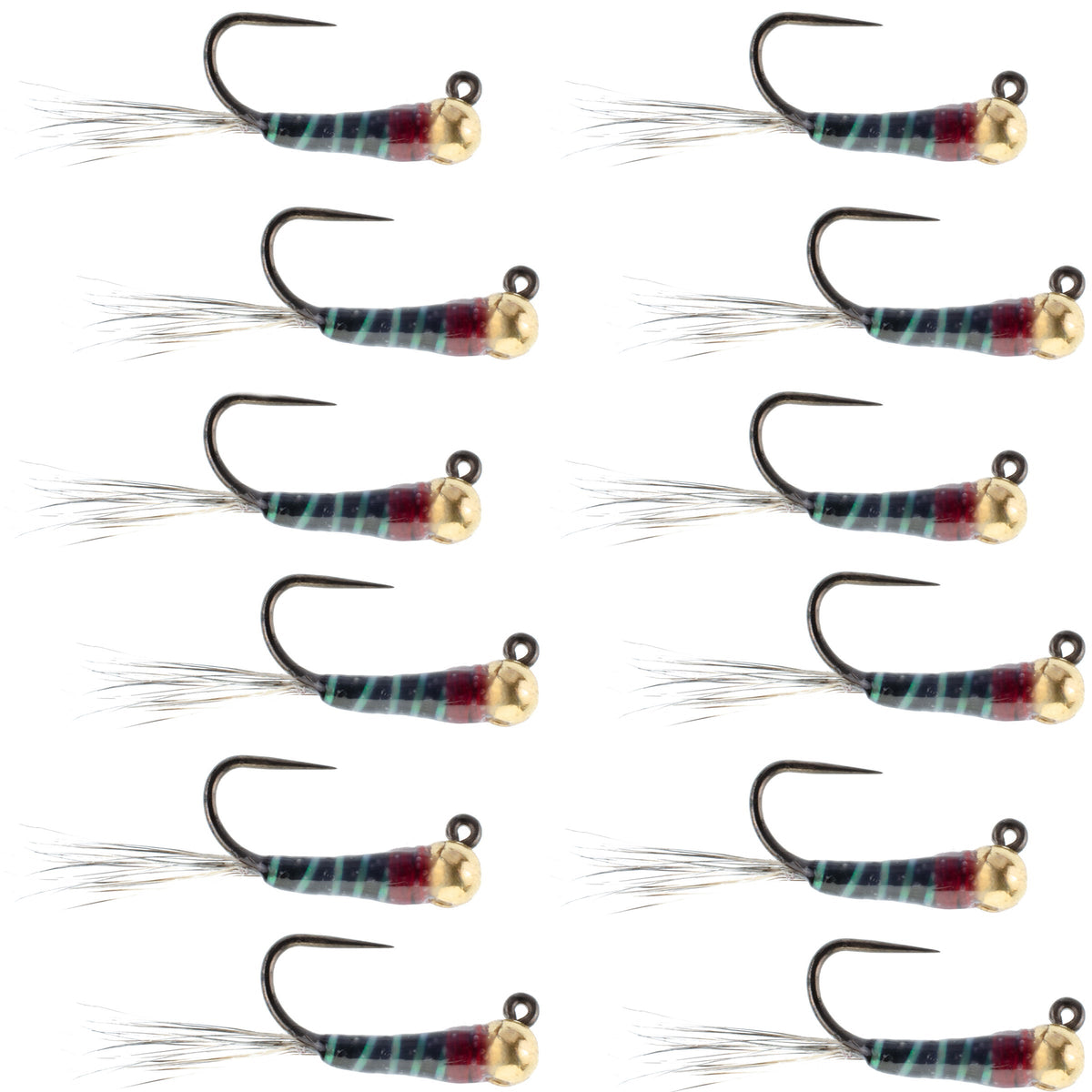 Spanish Tactical multiple jigged fly rigs have become the go to method for fly fishing success, especially in competitive fly fishing. The Spanish Perdigon nymph has a slick, slender finish that allows it to sink quickly. Tungsten beads for getting deep in the water column quickly in the faster waters that Euro fly fishers typically fish. Czech, Euro-style and Tactical nymphing uses the small profile of the fly and the tungsten bead head to get the lightly dressed flies deep in the water column quickly. The jig fly hook results in the fly swimming hook point up, allowing for more hookups and fewer snags. Perfect for hopper dropper indicator fly fishing. Hand Tied Bead Head Tactical Spanish Euro Polish Czech Nymph Flies - Set of 12 Flies Hook Size 14