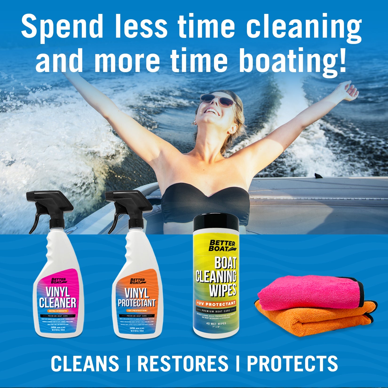 Looking for the complete boat detail kit for cleaning your vessel's interior or looking for that special birthday gift for boaters, Christmas gifts boat or boat gifts for dad? Our set comes with everything needed to clean and care for your boating interior. Our advanced formula boat vinyl cleaner cleans, conditions and protects leather and vinyl. Use in conjunction with our included Vinyl Protectant and Boat wipes to revive suppleness, restore color and leave a high-gloss shine protective finish. This perfect gift for boat owners comes with 2 microfiber cloths as well as detailed instructions for all products.