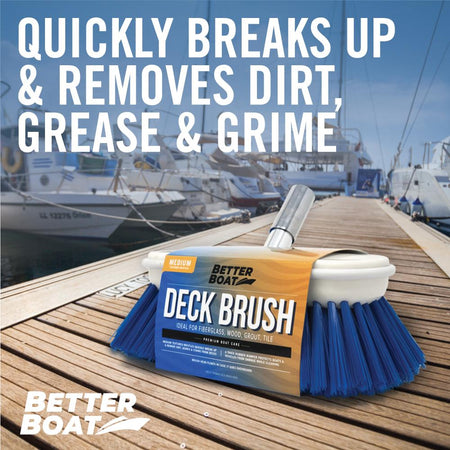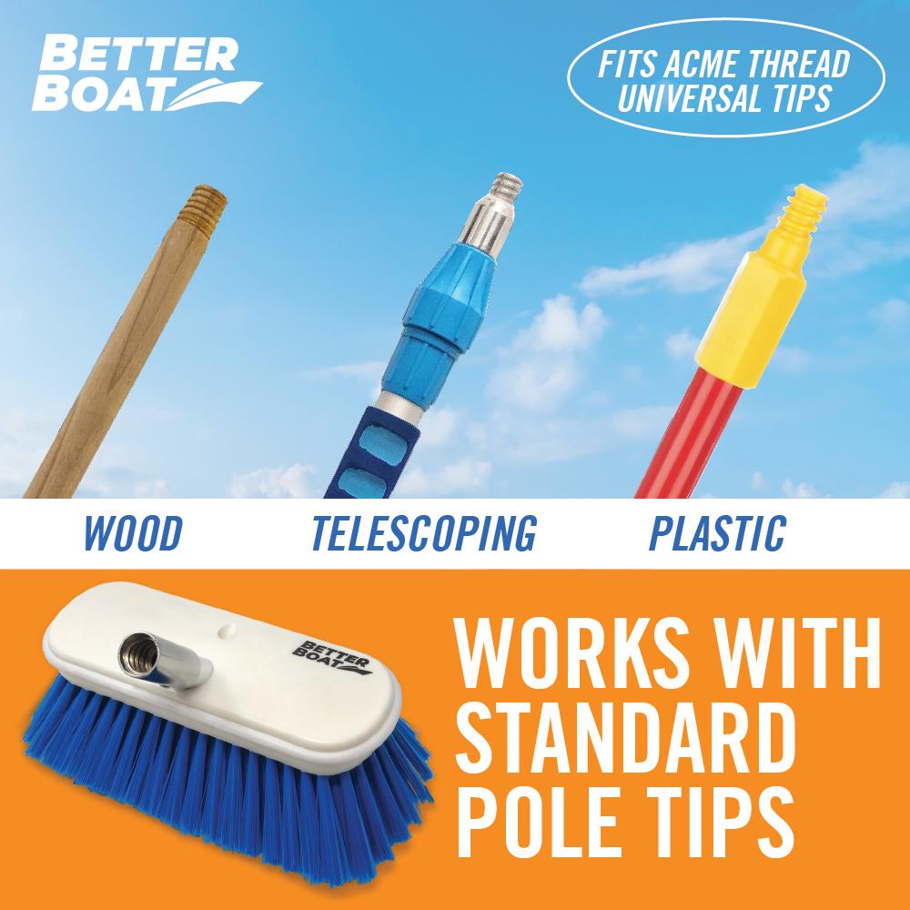 Our bristle deck brush available in firm, medium or soft bristles works great to clean decks, boat exteriors, your home and more. The bristles are soft enough to get in little nooks and crannies, yet stiff enough to be able to give surfaces a good scrubbing. This brush for cleaning decking removes tough build-up from wood, fiberglass, tile, metal, glass and more. The bristle brush head measures 8" wide at the base and has a large, deep, face (5" x 10") to cover a lot of ground quickly. Features a standard 3/4" Acme thread that works with a variety of rods to suit different cleaning needs. Try this bristle broom risk-free for 30 days - love it or get your money back!
