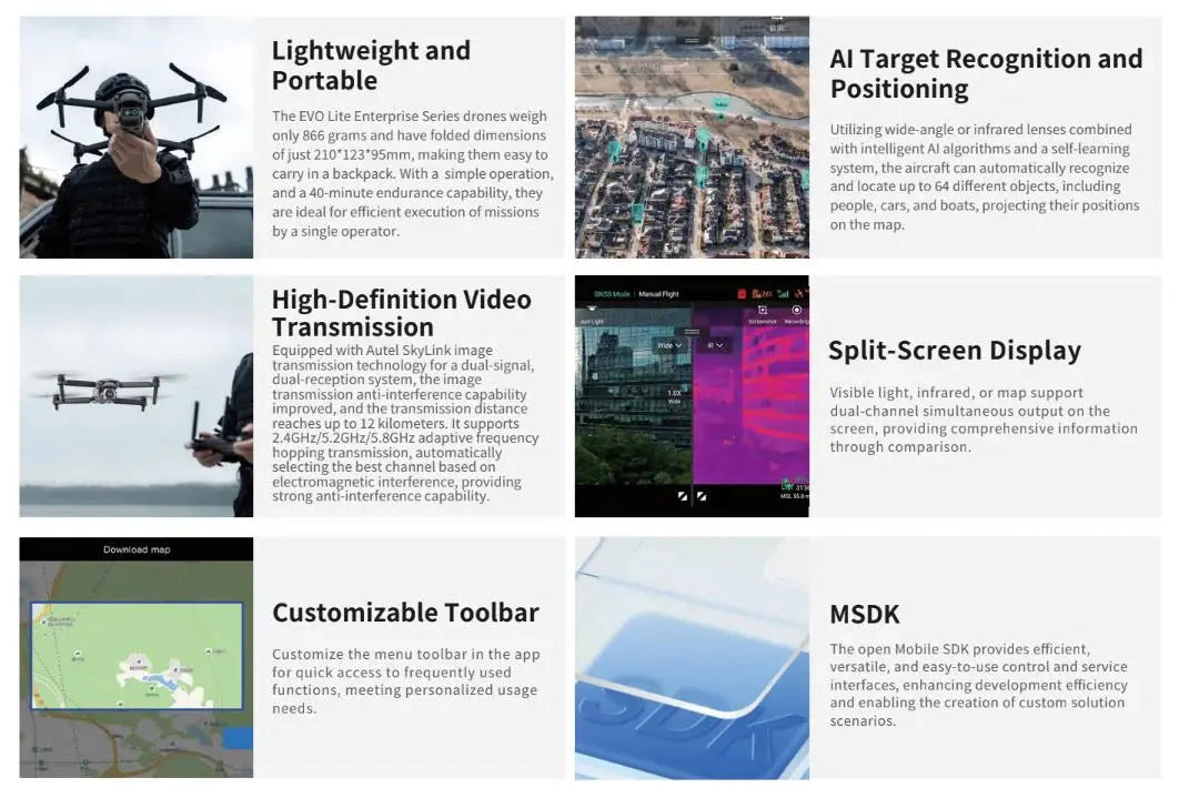 The EVO Lite Enterprise Series, by Autel Robotics, offers multiple advantages such as a lightweight and portable design, rapid deployment, and simple control for industrial applications. The AI target recognition feature enables the aircraft to easily identify and map various target objects automatically. The three-way binocular vision obstacle avoidance provides a safe flying experience. The EVO Lite 6K Enterprise is equipped with a 1-inch CMOS visible-light camera, offering outstanding sensitivity for excellent image quality. Paired with the Autel Enterprise professional flight software, it offers easy operation, user-friendly interaction, flexible single-person deployment, and efficient application in scenarios such as public safety and emergency rescue.
