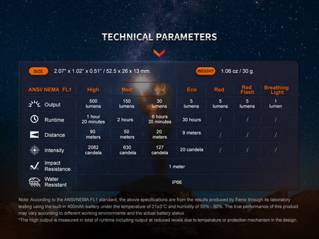 The Fenix E03R V2.0 keychain flashlight provides a bright 500 lumen beam of light with a range of nearly 300 feet (90 meters). This pocket-sized device is impressively robust, constructed from CNC machined full metal, and measuring just 2'' long. It offers a USB Type-C charging port, a 400 mAh battery, and an LED indicator to let you know when it needs to be recharged. With IP66-rated splash-proof and dust-proof ratings, it will make a fantastic EDC light and excellent gift for anyone seeking durable illumination on the go. Incredibly powerful yet conveniently small, the Fenix E03R V2.0 is sure to become an instant favorite.