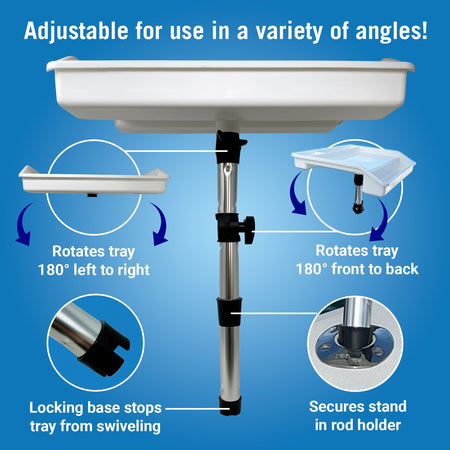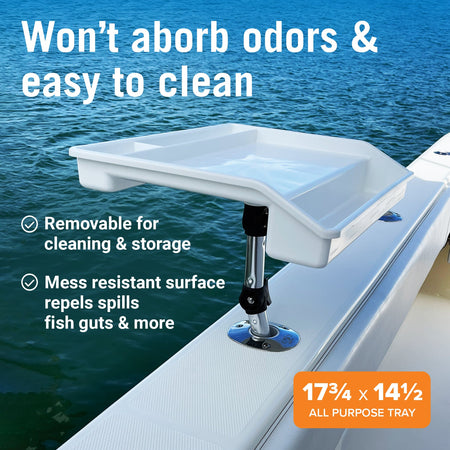 Our premium-grade fish and bait cutting board for boats is constructed from the marine-grade commercial quality polyethylene. This fish table is UV resistant and measures 17.75 inches by 14.5 inches. The inner working area measures 16.75 inches by 8.5 inches. You have 3 drip proof sections with depths up to 2” to store fillet knives, lures, hooks or other accessories for boats. The table top of our rod holder cutting board will not crack, peel or absorb fish odors and includes a 40 cm embedded measuring ruler. Unlike other boat fishing tables, our aluminum crafted supporting arm pivots with 2 separate joints to allow use in various different rod holder locations. Easily adjust both left to right and front to back to get a level work surface. Our fish cutting board for boats easily removes for storage and cleaning.