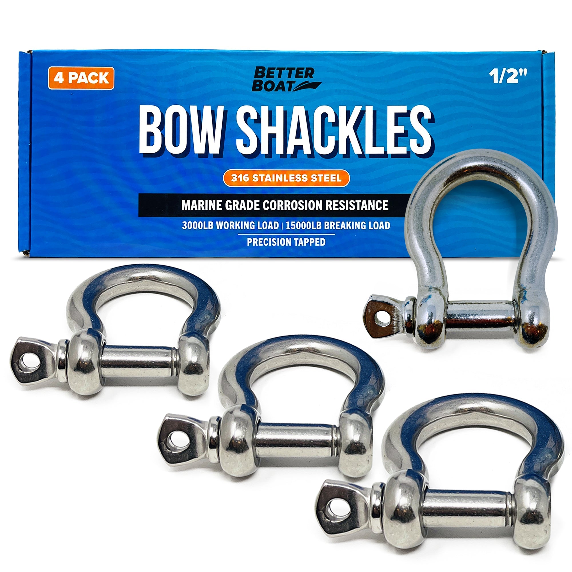 • ROBUST AND POWERFUL: Engineered for resilience, our D shackle set excels in challenging environments, promising enduring utility. Our robust 1/2" shackles deliver a 3000lb working load and a 15000lb breaking load. The 3/8" models offer a 2500lb working load and a 12000lb breaking load. For lighter applications, our 5/16" shackles provide a 1300lb working load and a 6600lb breaking load, while the 1/4" versions have a 750lb working load and a 3800lb breaking load. Ideal for use as clevis shackles or bow rings.