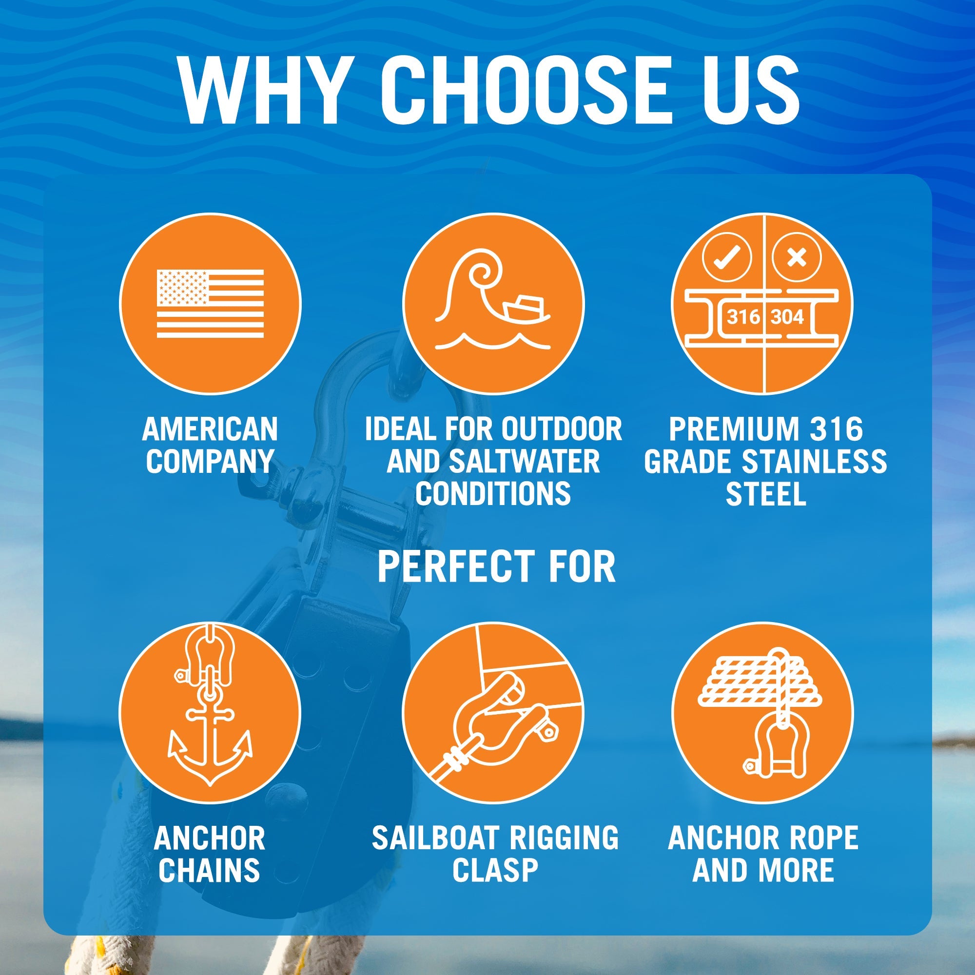 • MULTI-PURPOSE AND DEPENDABLE: Crafted from superior 316 Grade Stainless Steel, our Bow ring shackles are expertly designed to manage hefty loads, ensuring a reliable link for various needs such as anchor chains, sailboat rigging clasps, and anchor ropes.