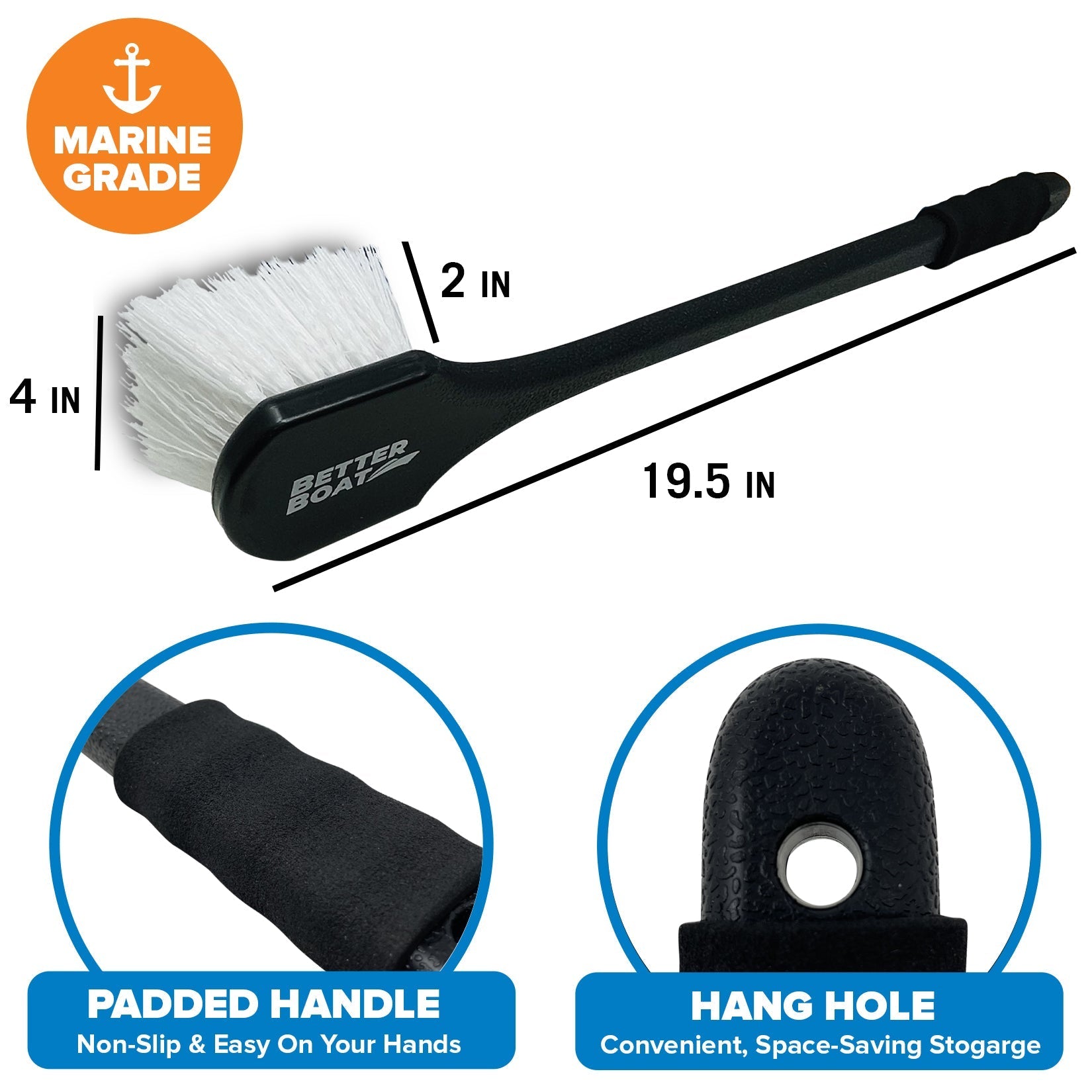 Our premium marine-grade, stiff nylon scrub brush quickly breaks up grime to remove stubborn stains from surfaces with ease! It’s a great value multi-purpose cleaning brush that cuts through dirt and debris on your boat, cars and all around the home keeping surfaces spotless. The padded, ergonomic handle on our heavy-duty handheld scrub brush reduces strain on your hand and gives you outstanding grip even in wet conditions. It also features a convent hang hole design for easy storage. This multipurpose utility brush for cleaning has a wide face to cover a lot of ground quickly and make your job easier! We proudly stand behind the quality of all our products.