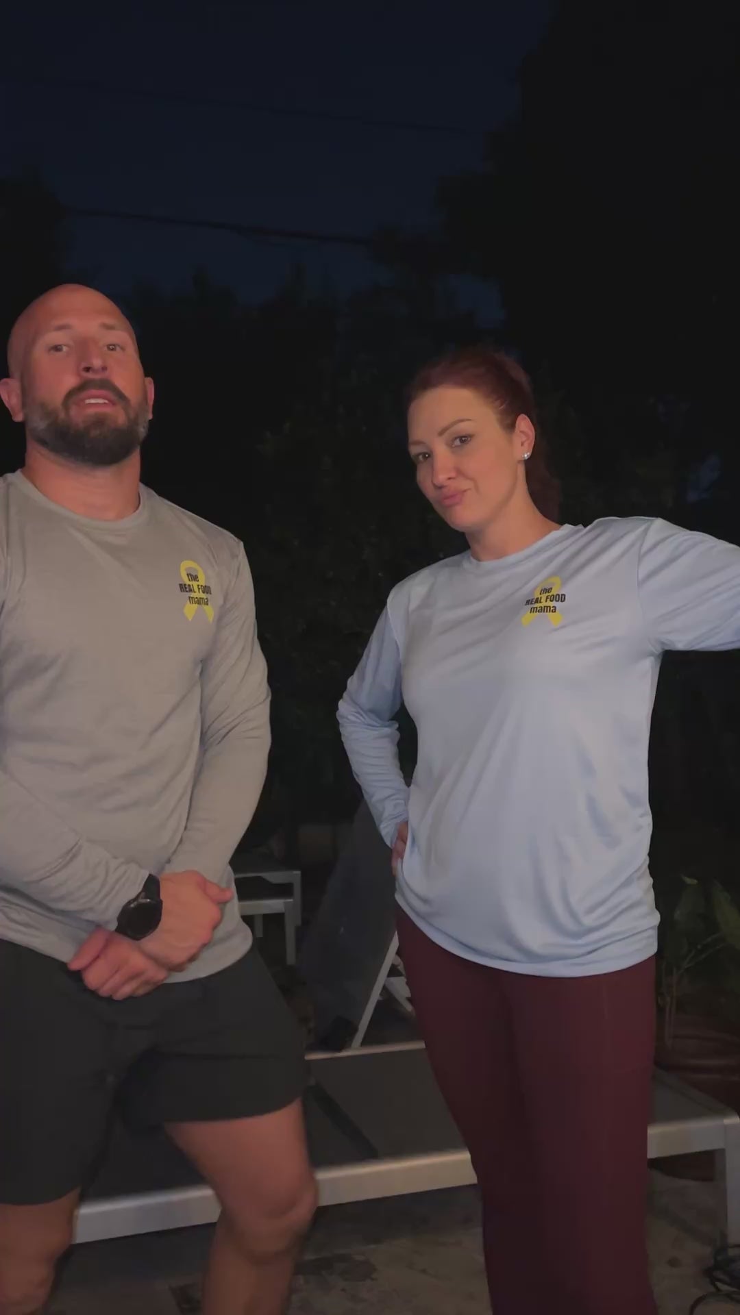 Performance long-sleeve featuring Angie’s sarcoma fight design: front yellow ribbon with “the REAL FOOD mama,” and back print with ZERO FEAR. ALL FIGHT. BUILT DIFFERENT.