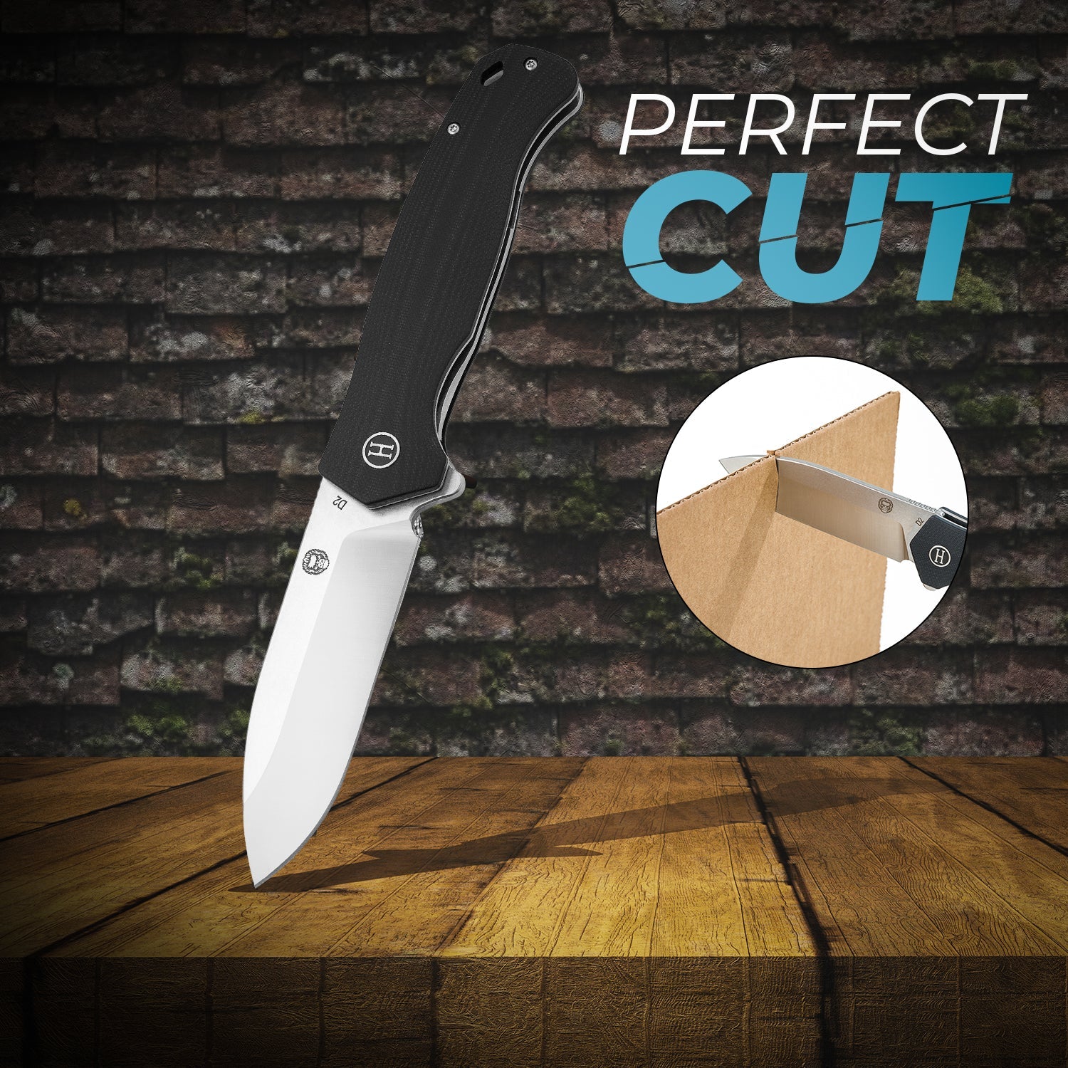 • ✅ ALWAYS BE PREPARED FOR EMERGENCIES: This premium 8.74" long folding pocket knife features a razor-sharp 3.82" blade made of D2 Steel guaranteed to cut easily wood, paper, plastic or aluminum without going blunt.